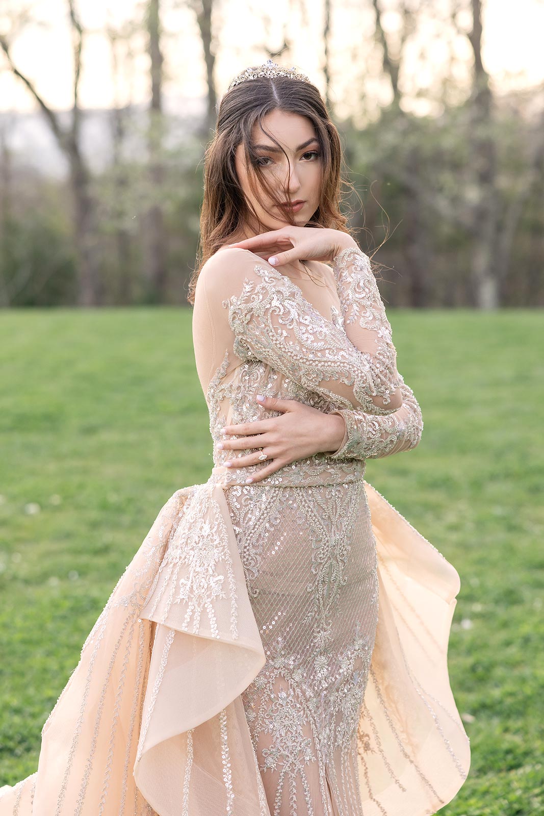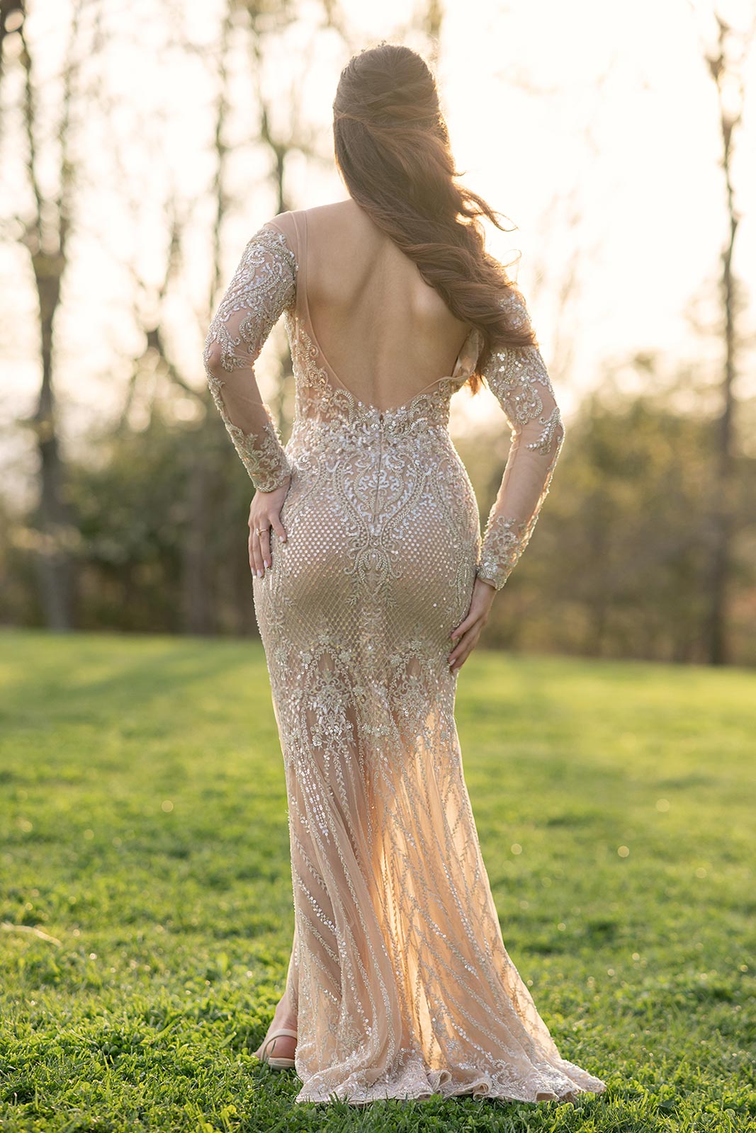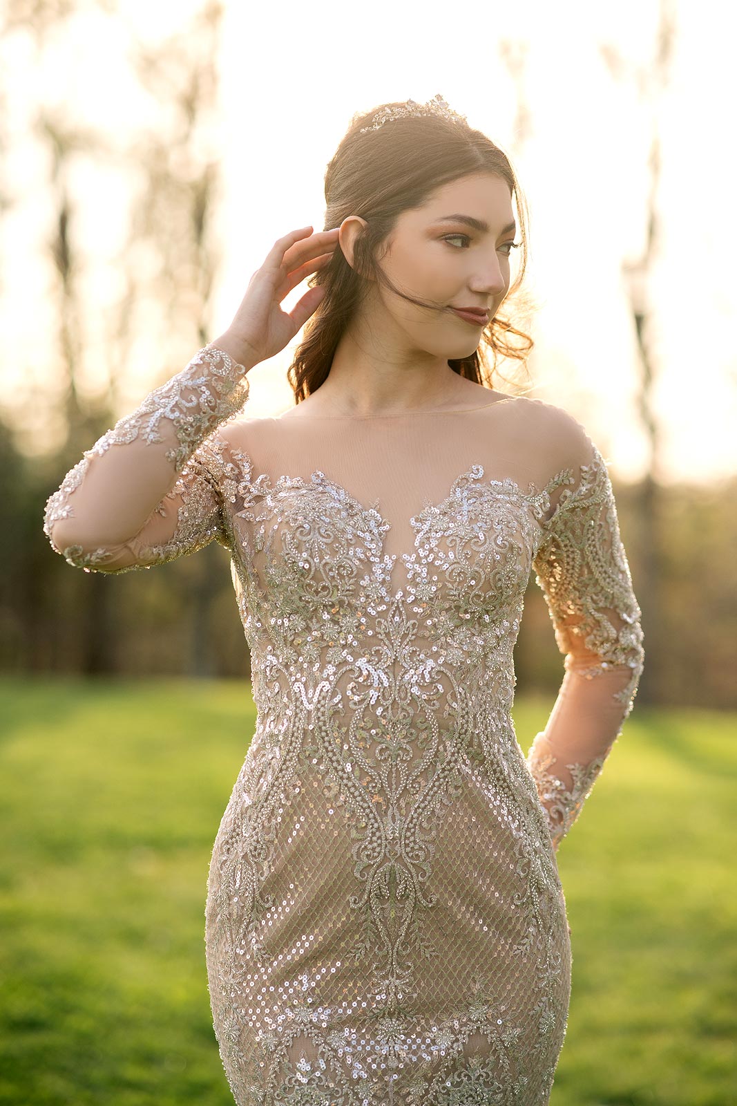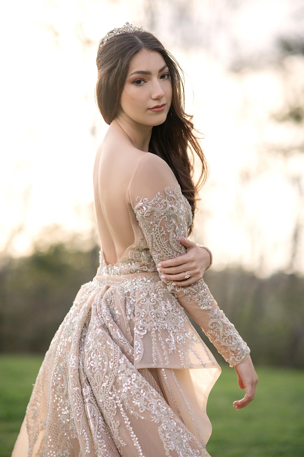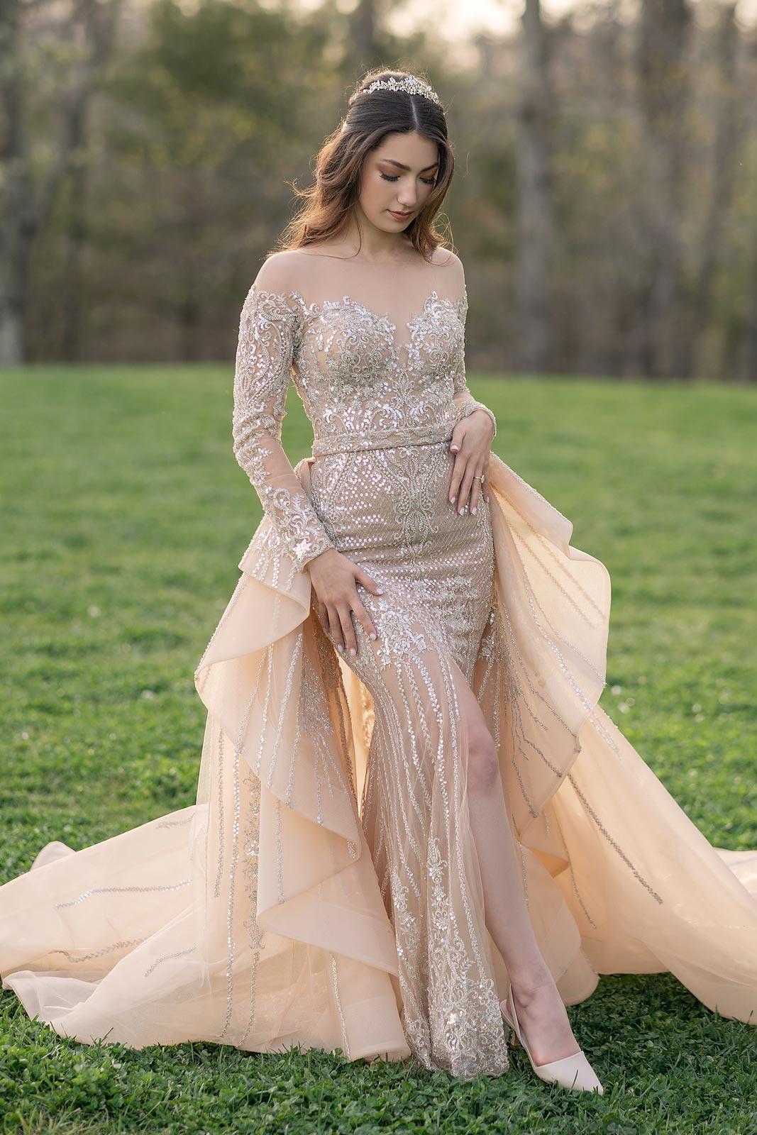 Evelina in a gold illusion wedding dress from Angela Kim Couture