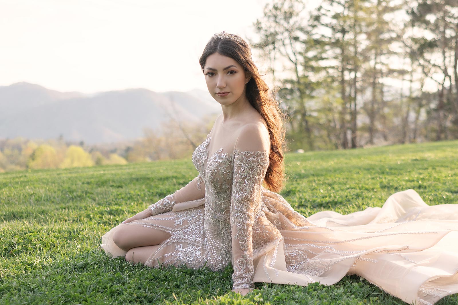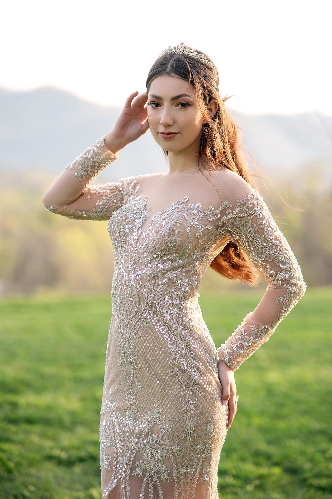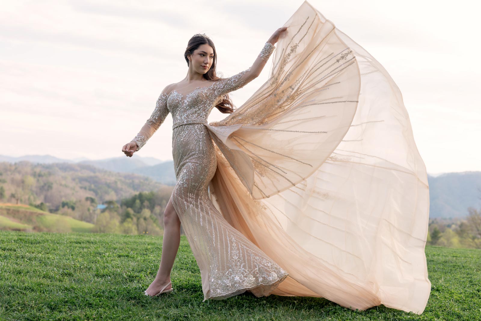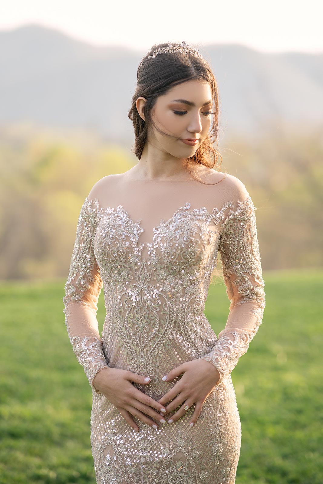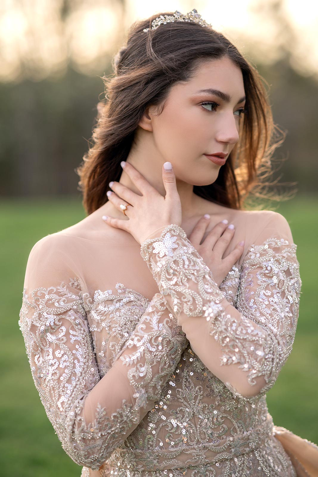 Evelina in a gold illusion wedding dress from Angela Kim Couture