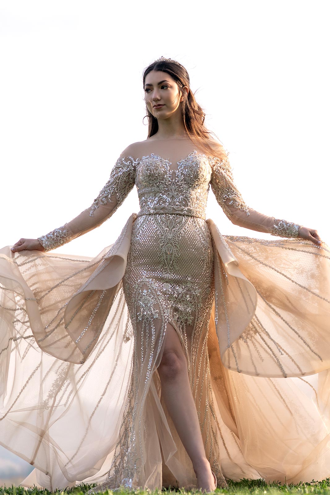 Evelina’s dress consists of a figure hugging mermaid dress with a voluminous overskirt. The dress features an illusion effect, elegant off the shoulder long sleeves, bare back and a front slit on the skirt for a tastefully sexy touch. The carefully hand placed embellishments, beads and sequins achieve a beautiful couture finish