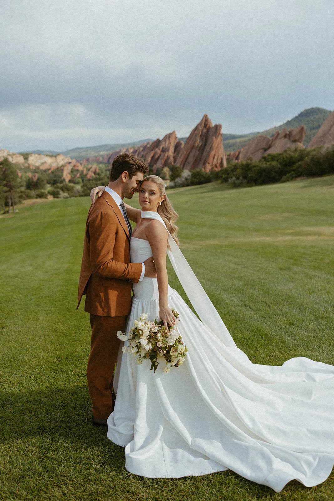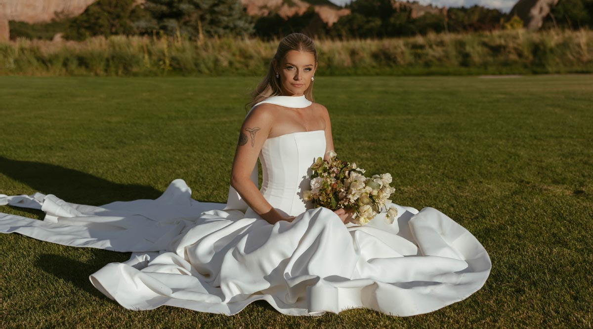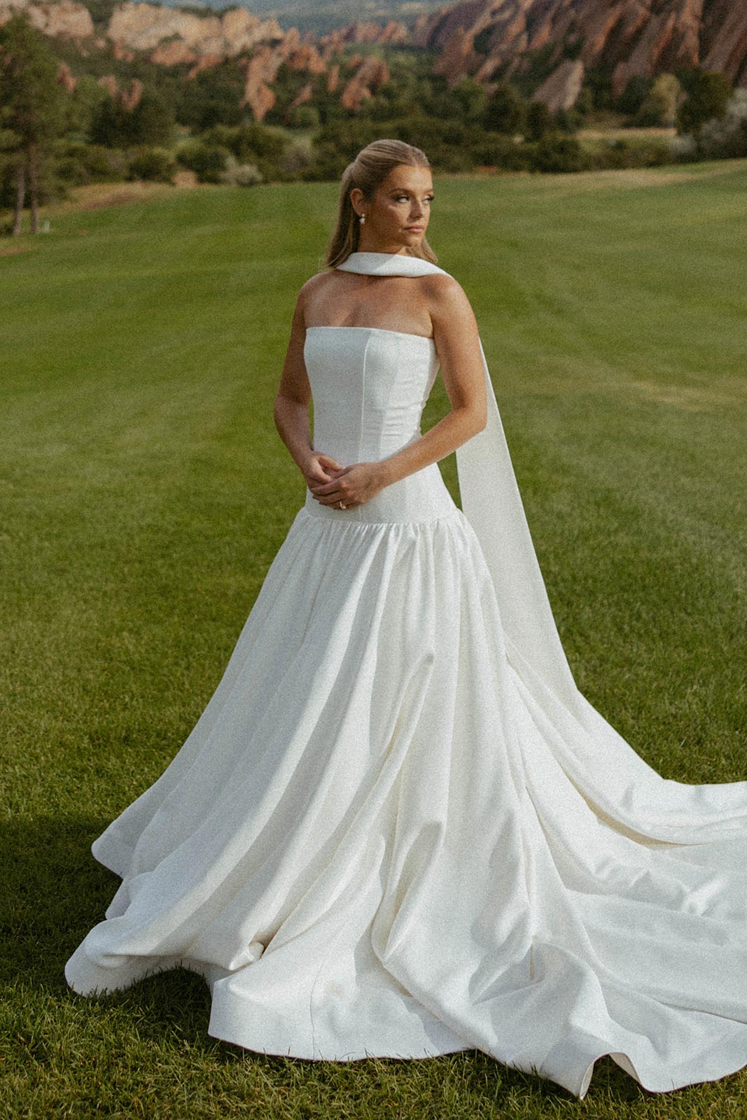 The hem is finished with wide horsehair for effortless movement, while the delicate neck veil adds a touch of drama and refinement. Chic, understated, and eternally elegant, Hannah’s dress is a statement of refined sophistication.