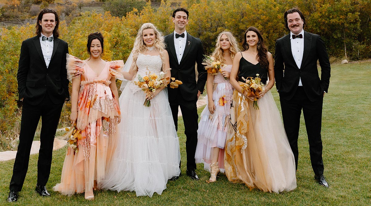Kaitlin’s wedding dress is a masterful fusion of French elegance and Western flair, featuring a chic 5-piece ensemble. The corset, designed to accentuate the waist, boasts a dramatic cat-eye neckline that lends a distinct, modern edge. Its rich textures and heavy embellishments add a touch of opulence. The look is further elevated by detachable long puff sleeves, offering versatility and a dramatic flair.