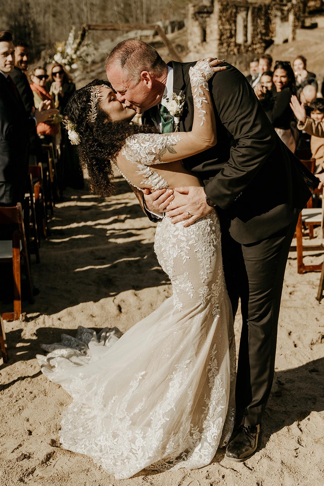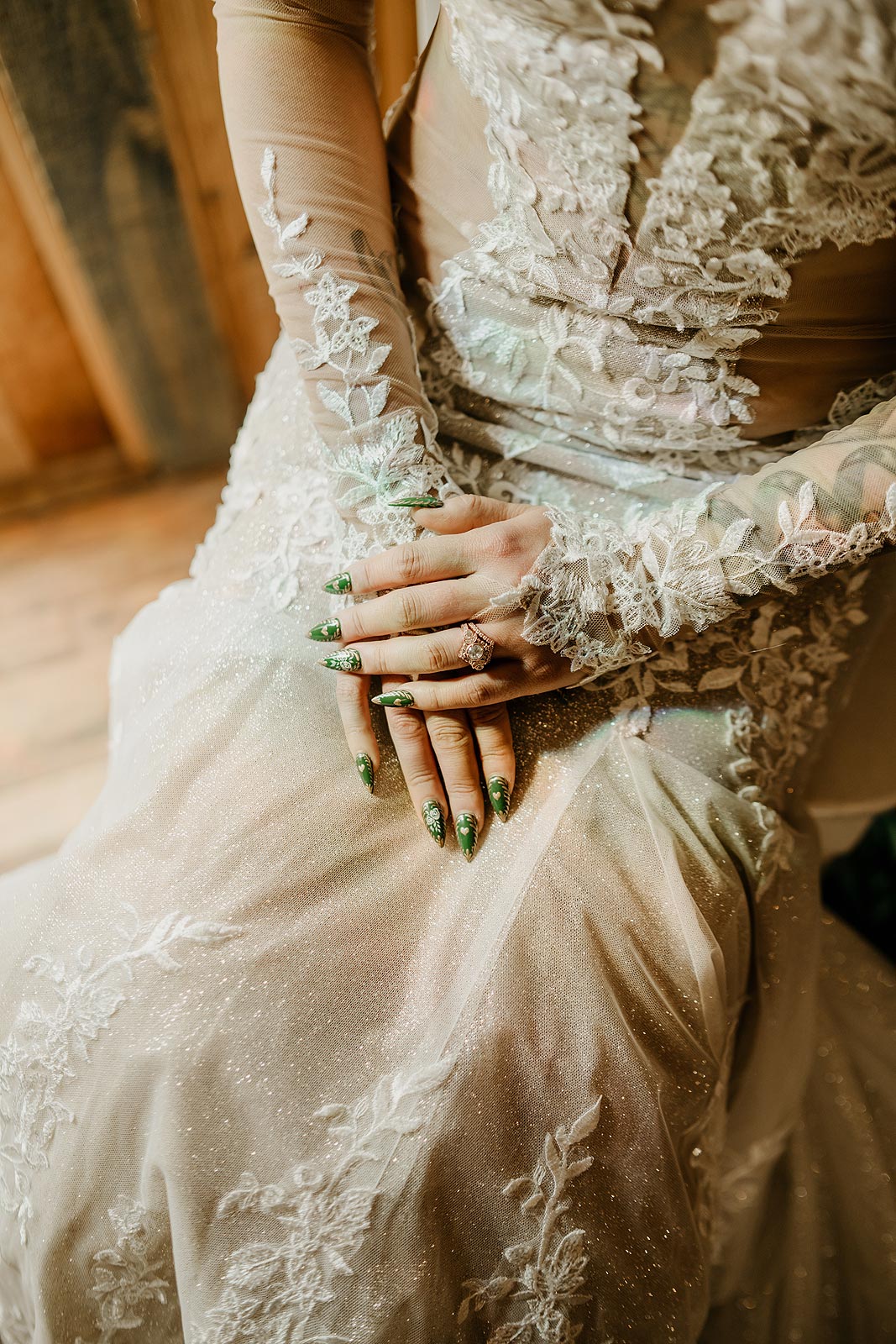 Yume’s alluring cutout wedding dress features a graceful mermaid silhouette that contours her curves down to the mid thigh before flaring out. Other features include a plunging neckline and romantic off-the-shoulder sleeves adorned with delicate lace embellishments. The cathedral length train comes with a convenient bustles, while power mesh lining provides comfort and a sheer look.